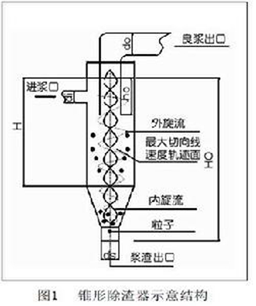 漿泵將紙漿輸送至重物除渣器的螺旋入口(進(jìn)漿口一般在重物除渣器中上部)時(shí),使紙漿通過(guò)旋轉(zhuǎn)產(chǎn)生的離心力將紙漿內(nèi)較重的物體(如鐵釘、石塊、訂書針、沙子等)分離至(重物除渣器下部)有水的罐體內(nèi),因?yàn)橄虏抗摅w內(nèi)的水壓將懸浮在罐內(nèi)上部的良漿逼迫至(重物除渣器的上部)出口后通過(guò)輸送管道輸送至其它設(shè)備或漿池內(nèi)。